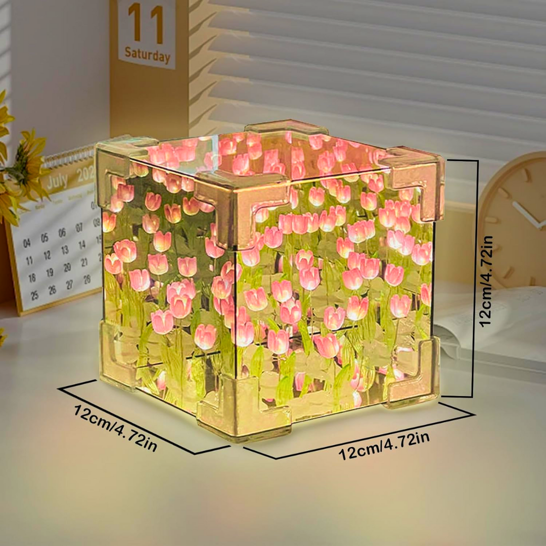 Tamaño perfecto para mesas y estanterías. Un cubo decorativo con tulipanes rosados y luz cálida. Ideal para quienes buscan estilo, armonía y un toque emocional en su decoración.